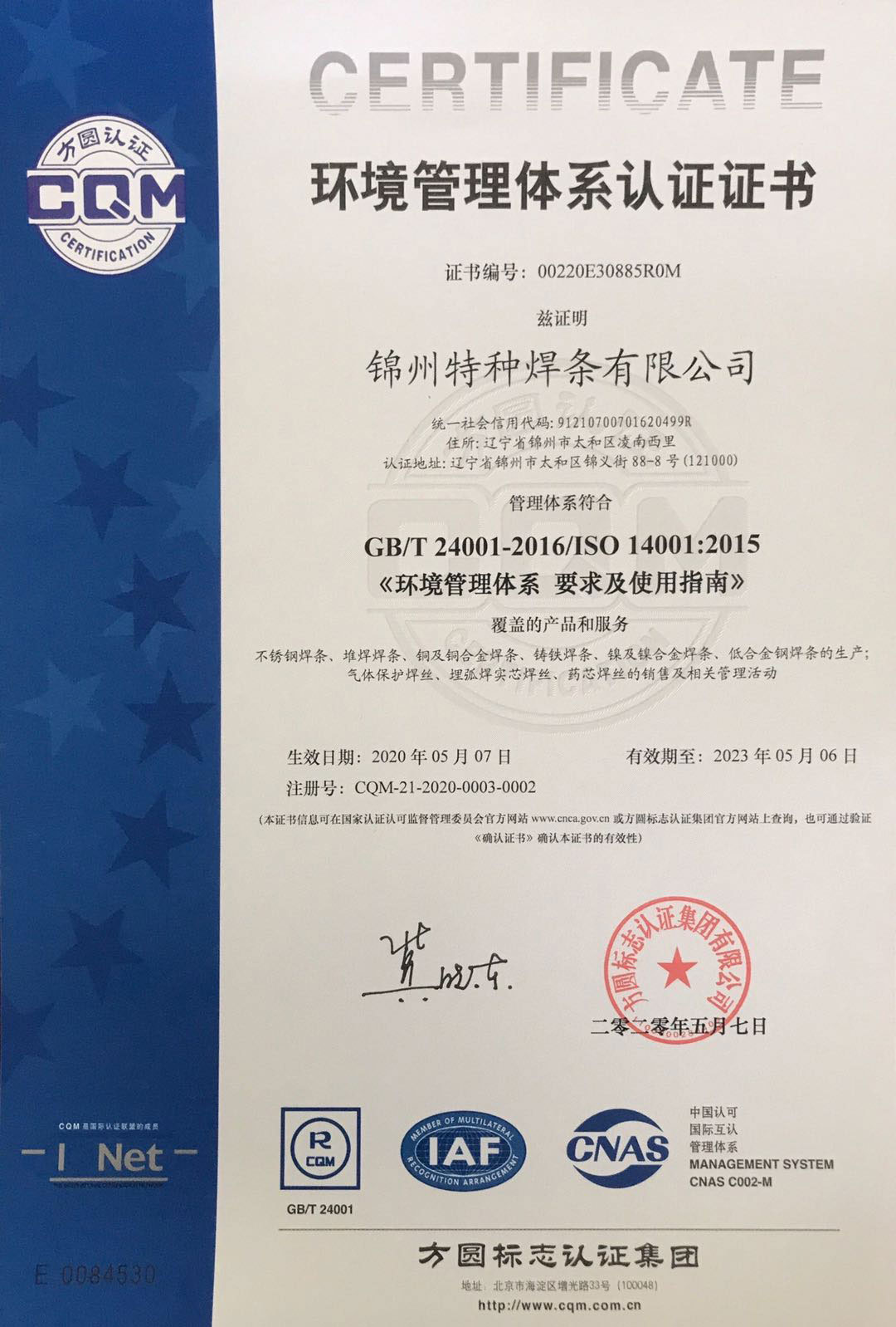 Certification Category:GB/T 24001-2016/ISO 14001:2015 Environmental management systems-Requirements with guidance for use