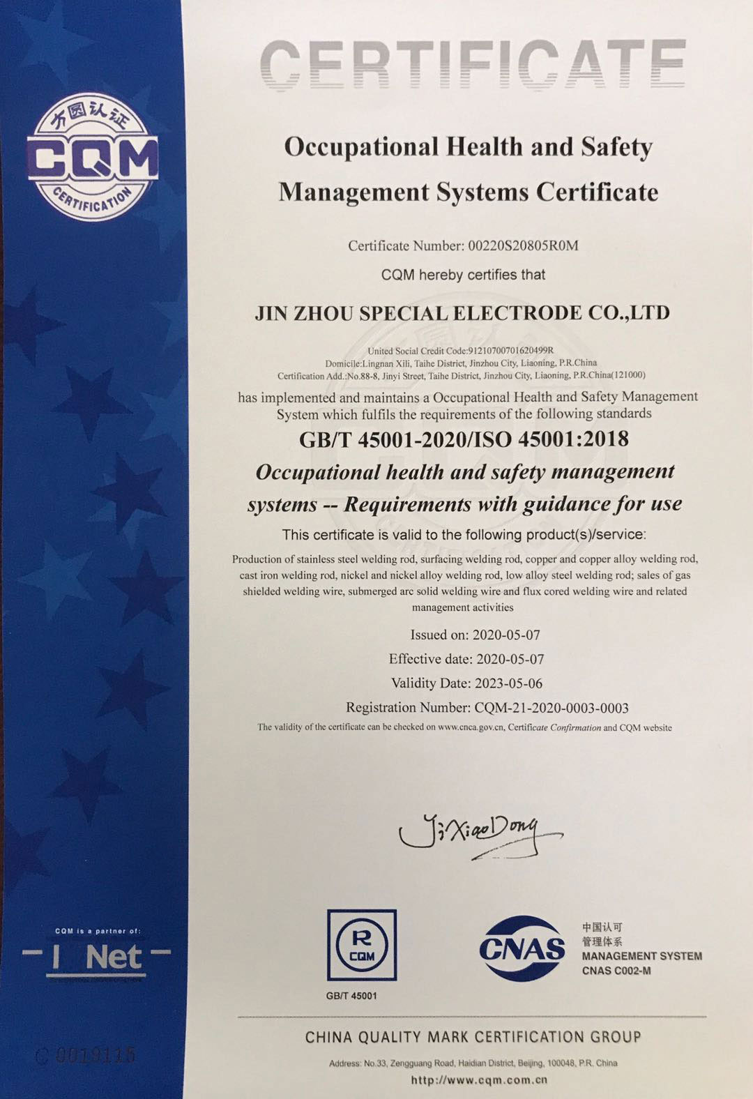 Certification Category:GB/T 45001-2020/ISO 45001:2018 Occupational health and safety management systems -- Requirements with guidance for use